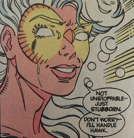 | During events in Druspa Tau and afterwards, Dove is much more assured and confident in her abilities. This isn't arrogance or bravado (like Hawk); this is simply Dove KNOWING she can handle whatever comes her way. "No storm can shake her inmost calm," indeed! Yet her humility remains, because she knows that her strength as Dove is balanced by her weakness in her normal human form. She isn't truly a goddess, and she knows that, but she can use the powers she does have to help others around her. |  |