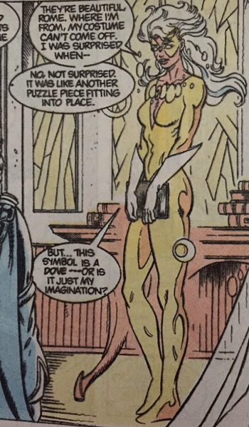 | After being in Druspa Tau, however, Dove's street-level superhero powers take on a mystical glow--literally! She can now fly and carry others (which usually means Hawk when he's gotten into a bigger fight than he can handle alone). Plus, her powers of perception are now nearly psychic, predicting much farther into the future than before. Dove also gains an additional costume, which she sports only in Druspa Tau--a bodysuit of gleaming white and gold, seen at left. |