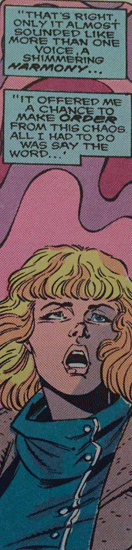 Dawn Granger is a fairly ordinary young woman, studying abroad at Oxford University in England--at least until 9:11 pm on the day of Don Hall's death. Unbeknownst to her, back in America (5 hours behind the time in England), Don has just attempted to save some children from being crushed by a falling wall. The children survive; Don does not, perishing at exactly 4:11 pm Eastern Standard time. At this time, there's a terrorist scare at the American Embassy in London; Dawn's mother is in England on diplomatic business, and is captured by this group of terrorists, who say on TV that they will blow the Embassy up at precisely 9:11 pm. Dawn is panicked--and then, suddenly, a voice (or a cloud of shimmering voices) speaks to her, saying that she has the power to bring order out of this chaos, if she will only speak the word "DOVE." |